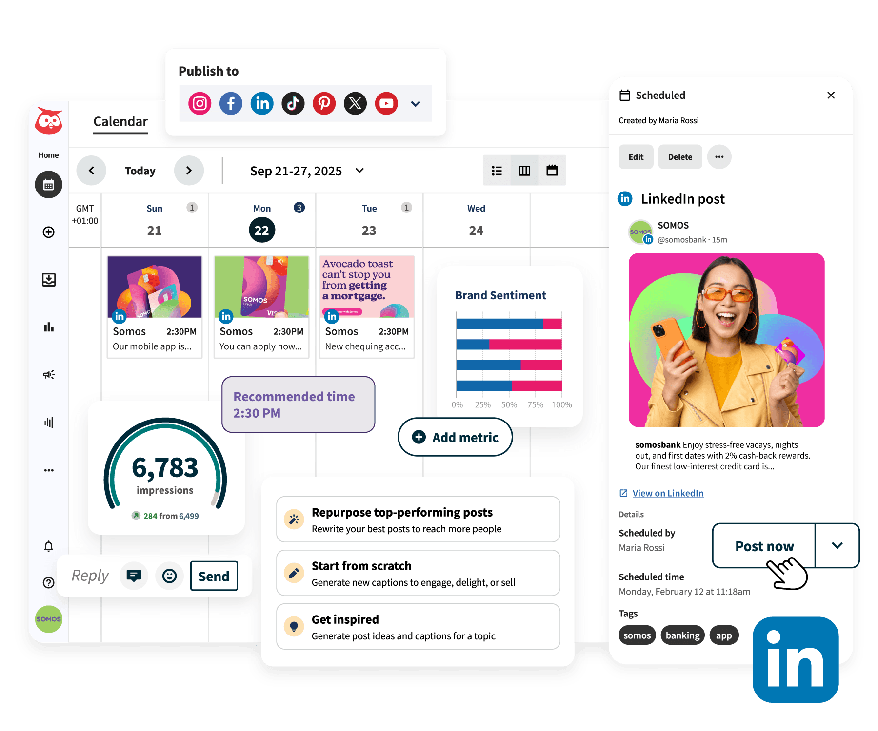 With OwlyWriter AI, you can instantly generate LinkedIn posts and fill your content calendar in seconds — without the brain drain. Plus, use it to repurpose your top-performing posts and slash hours from your workweek.